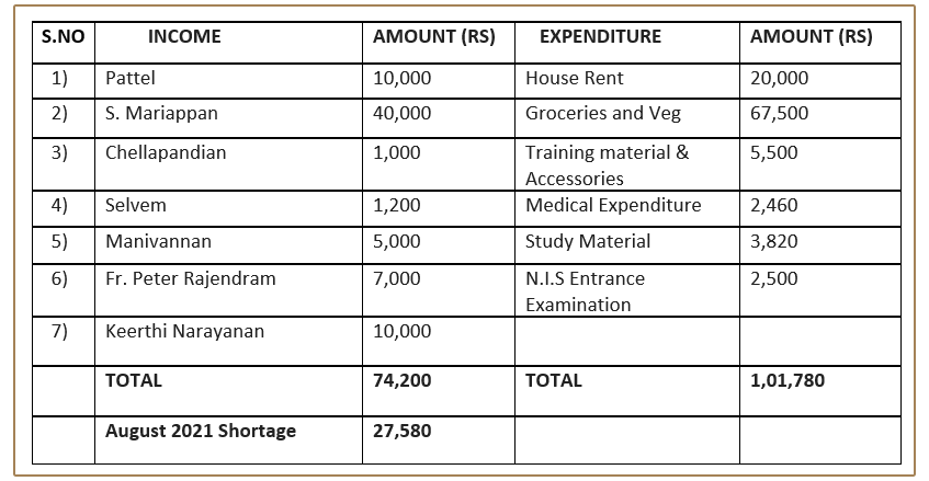 We are not doing great financially. Mr.S. Mariappan, our coach and mentor, contributes his pension funds to the trust in total. Apart from this, we have very few regular monthly contributors. Therefore, the periodic expenditure over income is causing severe strain on our finances and eating into the corpus fund. (The corpus fund is also from Mr.S. Mariappan's retirement benefits mostly)